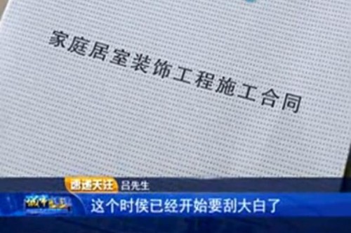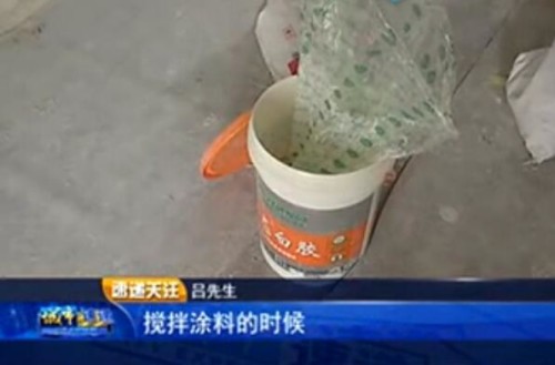 吕先生说,4月下旬自己找到西安大路典石广场百合装饰家居馆,并在家居馆里签订了装修合同。5月29日的时候,这个时候已经开始要刮大白了。正常来讲刮大白的第一层是应该用生态白胶的,但是我们发现工人在施工的时候,搅拌涂料的时候,添加了这个108的建筑胶,然后(这)也是一种添加剂。