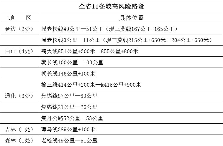 近期,吉林省公安厅交警总队按照公安部相关排查标准排查了全省11条较高风险路段、17处长大下坡危险路段和21处事故多发路段(详情见附件)。其中高风险路段主要分布在我省东部山区,多为急弯,临水临崖道路;在长大下坡危险路段行驶,驾驶人频繁刹车容易出现制动失灵,兰海高速甘肃兰州南收费站发生的“11·3”交通事故正是因为连续长下坡行驶中,频繁制动导致制动失灵,车辆失控与收费站广场内车辆相撞;事故多发路段是指近3年内,高速公路1公里、普通公路500米范围内发生3起以上造成人员死亡交通事故的,或者高速公路4公里、公路2公里范围内发生2起以上一次死亡3人以上交通事故的路段,其中延边敦化G201国道K707 500-K707 600路段,两年内发生两起一次死亡3人以上交通事故。吉林省公安厅交警总队此次向社会公布的高风险路段、长大下坡危险路段和事故多发路段都是容易发生交通事故的危险路段,提示广大驾驶人行经这些路段时要注意行车安全。