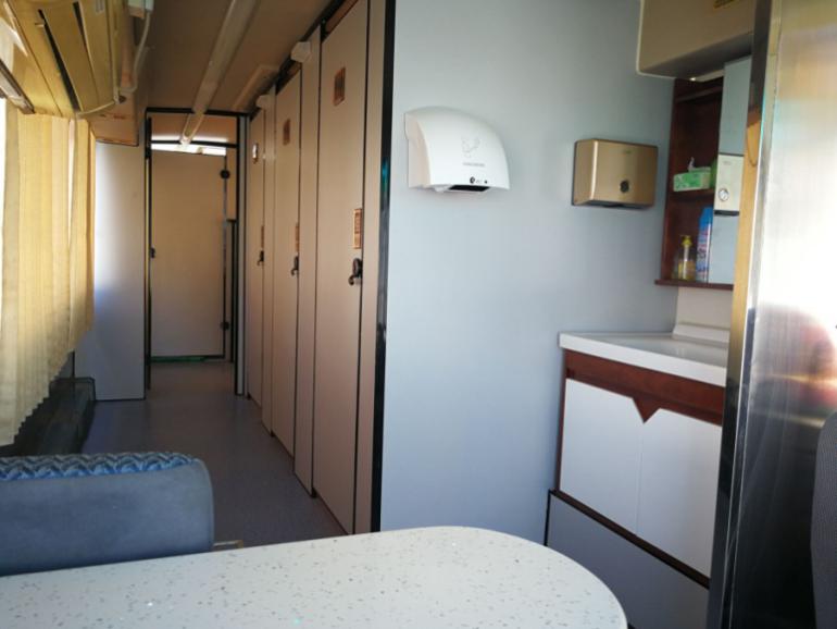 目前,在长春市体育场内,这辆“大客车”厕所已经停放在固定位置,从外观看,这是一辆普通的客车,当打开车门后,除前排的驾驶室外,车内都被改造成了洗手间。据了解,这台移动厕所设置了三个蹲位和四个便位,其中三个蹲位是分隔式的单间,便位与蹲位之间也有封闭措施。