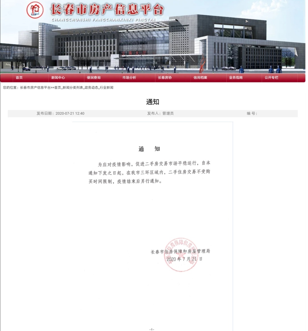 7月21日,长春市住房保障和房屋管理局下发通知:“为应对疫情影响,促进二手房交易市场平稳,自本通知下发至日起,在我市三环区域内,二手住房交易不受购买时间限制,疫情结束后另行通知。”