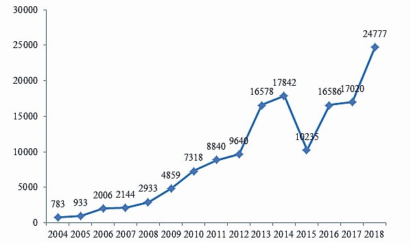 2004年-2018年汽车产品缺陷线索报告数量