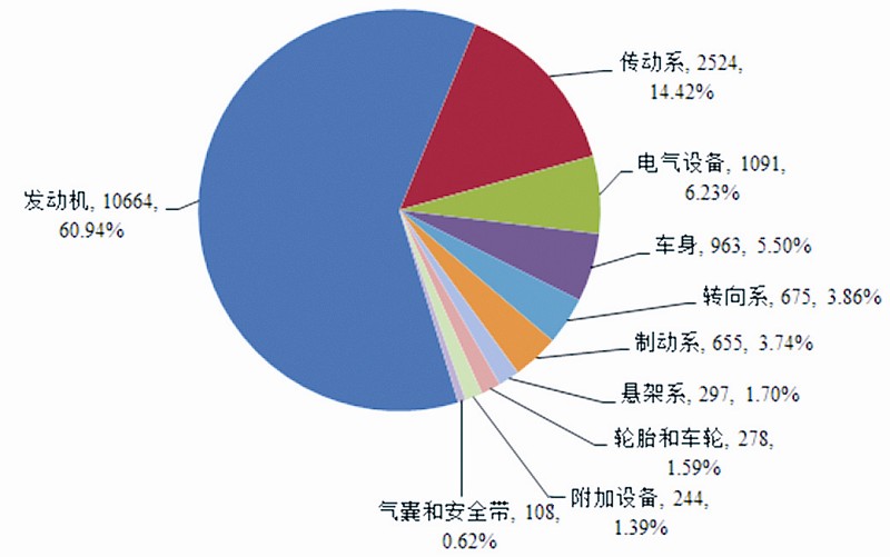 随着机动车保有量不断增加,机动车产品安全问题也备受关注。2018年全国汽车产品缺陷信息采集系统共收到2.48万条消费者提交的汽车产品缺陷线索报告。按缺陷部位所属车辆总成分类,涉及发动机总成的缺陷报告10664例,占60.94%;其次是传动系2524例,占14.42%;电气设备1091例,占6.23%;车身963例,占5.50%;转向系675例,占3.86%;制动系655例,占3.74%;悬架系297例,占1.70%;轮胎和车轮278例,占1.59%;附加设备244例,占1.39%;气囊和安全带108例,占0.62%。
