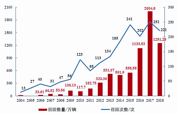 2004年-2018年汽车产品召回的次数与数量