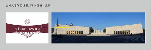 内页是吉林大学标志与吉林大学校训,其中装饰图形颜色与封套颜色一致,形状取自于吉林大学中心校区校门,似飞翔的大雁,象征吉林大学毕业生走向社会后,在广阔天地中自由翱翔。而造型优美的植物纹样,寓意吉林大学毕业生前程似锦。