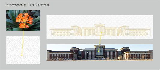 证书采用简约大气、清丽典雅的设计风格,不乏庄重严谨内蕴的同时,富含时代气息与形式美感。底纹以君子兰花卉为创意元素。君子兰作为长春市市花,内敛含蓄,姿容高雅,取义吉林大学学子具有君子般的品格和风采。此外,君子兰具有“团结奋斗、勇于创新”的精神,与吉林大学“求实创新、励志图强”的大学精神高度契合。