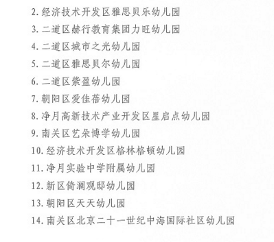 依据《长春市幼儿园定类评估标准》《长春市民办幼儿园定类评估标准》及市专家组的评估结果,长春市教育局决定,命名宽城区第二实验幼儿园等4所幼儿园为长春市示范幼儿园;命名汽车经济技术开发区长沈路幼儿园等7所幼儿园为长春市一类幼儿园;命名绿园区圣特尔幼儿园等5所幼儿园为长春市民办示范园;命名新区嘉禾幼儿园等13所幼儿园为长春市一类民办幼儿园。