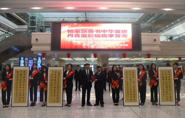 开幕仪式上吉林省图书馆书记吴爱云表示:吉林工商学院是我省一所特色鲜明的应用型大学,吉林工商学院师生创作的优秀作品,笔墨飘香,洋溢着校园文化的气息,散发着浓郁的艺术魅力。希望通过省图这个平台,让更多的人欣赏到这些优秀的书法绘画作品。吉林工商学院书记、著名书法家初长洲向我馆捐赠了“梅、兰、竹、菊”书法作品,省图馆长赵瑞军向初长洲颁发了捐赠证书。