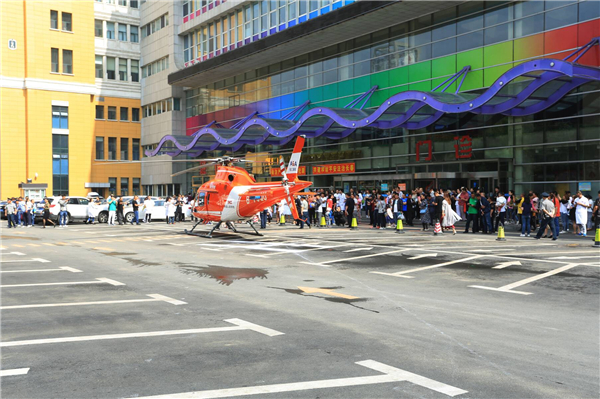 6月12日8时33分,一架直升飞机在长春市儿童医院上空盘旋两圈,缓缓降落至停机坪。